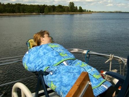 Am nächsten Tag (Himmelfahrt) ging es durch Jungfernsee und Sacrow-Paretzer Kanal in Richtung Brandenburg. Das Wetter war "durchwachsen". Meist wehte uns der Wind um die Nase, aber die Sonne gucke ab und zu mal durch die Wolken. Ein Mittags-Nickerchen war nur mit thermischer Isolation möglich.