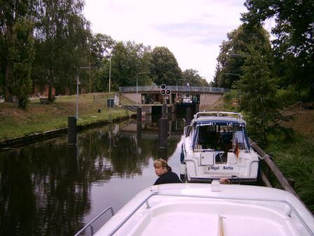 Wir nähern uns nach fast 3 Stunden interessanter Fahrt der Schleuse Wernsdorf. Die ist natürlich durch den Lastkahn gefüllt. Also dürfen wir sportlich warten.