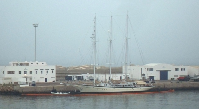 Am Dienstag, dem 13.10.2009 machen wir pünktlich um 07:00 Uhr in Casablanca fest. Die Stadt ist im Dunst kaum zu sehen, aber eine (die einzige) schöne Segelyacht. Der Besitzer hat sie gegen Hafendreck mit einer Ölsperre gesichert.